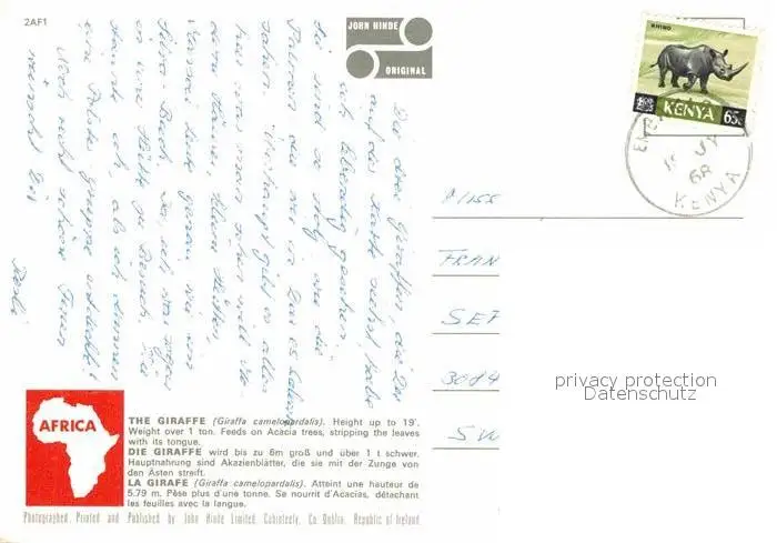 Giraffe Africa Tiere postalisch gelaufen 1968 Erhaltung siehe scans [PaolaD17] PaolPID1