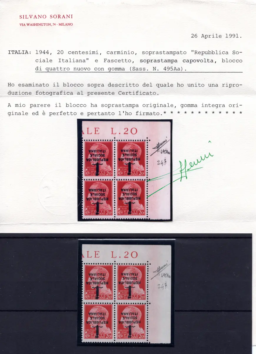 MNH - Vollgummi - - Giulio Cesare Nr. 495Aa prächtiges Viertel a. von f. umgedrehter Aufdruck - Selten - Zert. Sorani - Kat. euro 5.000 Cod.362/182