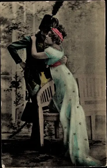 Glitzer Ak Frau umarmt einen Mann in Uniform