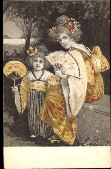 Glitzer Ak Frau und Kind in japanischen Trachten, Fächer, Kimono