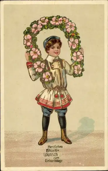 Glitzer Ak Glückwunsch Geburtstag, Junge in Tracht, Hufeisen