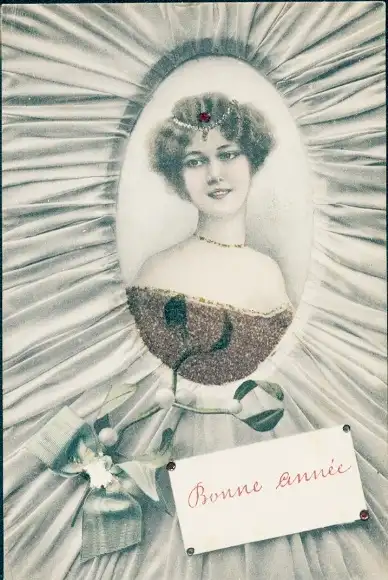 Glitzer Ak Glückwunsch Neujahr, Frau-Portrait, Mistelzweige
