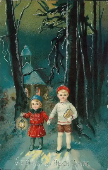 Glitzer Ak Glückwunsch Neujahr, Kinder im Wald, Handlaterne