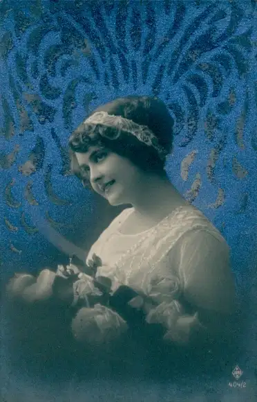Glitzer Ak Lächelnde Frau, Porträt, Blumenstrauß