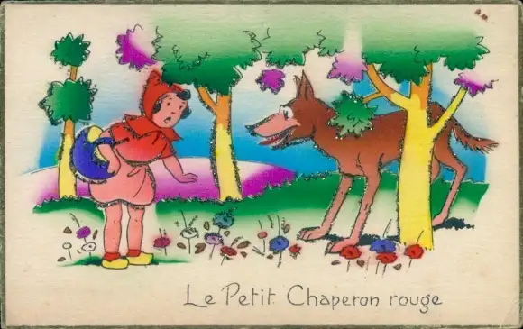 Glitzer Ak Märchen, Rotkäppchen, Wald, Wolf