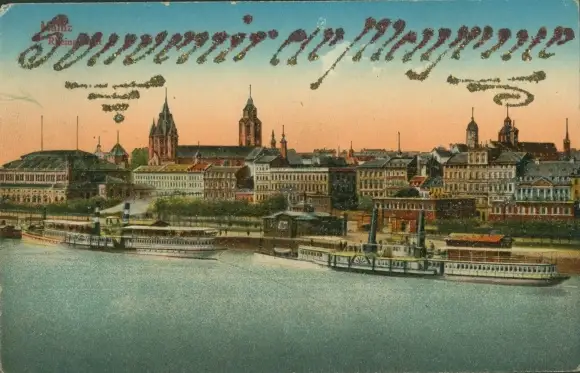 Glitzer Ak Mainz am Rhein, Mayence, Rheinansicht, Salondampfer