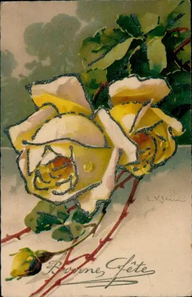 Glitzer Künstler Ak Klein, C., Glückwunsch, Gelbe Rosen