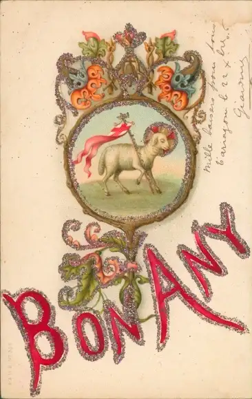 Glitzer Litho Glückwunsch Neujahr, Lamm, Blumen