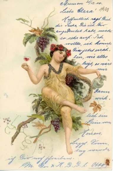 Glitzer Litho Junge Frau mit Weinglas, Weintrauben