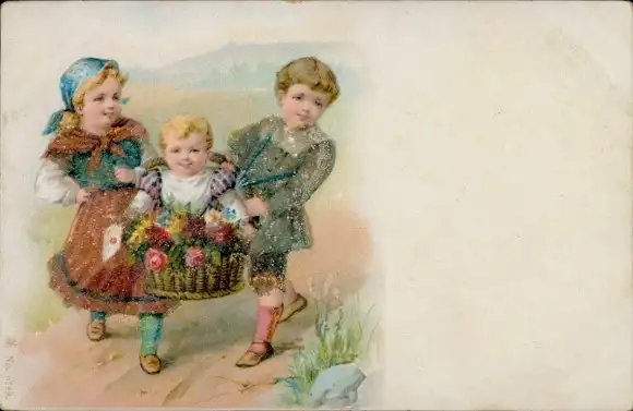 Glitzer Litho Kinder tragen Kleinkind in einem Blumenkorb