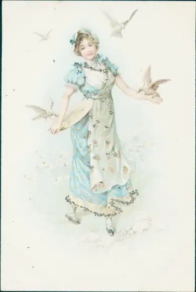 Glitzer Litho Noble Frau in blauem Kleid, Tauben