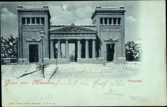 Glitzer Mondschein Ak München, Propyläen, Winter, Schnee