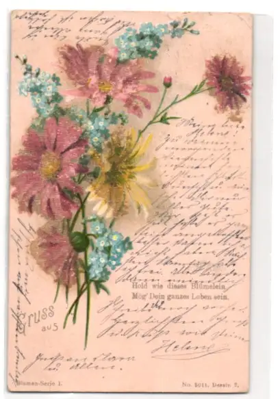 Glitzer-Perl-AK Astern und Vergissmeinnicht mit Glitzer-Perlen