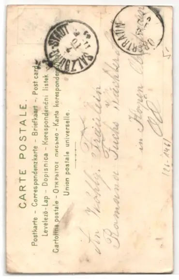 Personenbezogene Daten auf der Rückseite der Karte wurden durch blauen Textmarker unkenntlich gemacht. Die blauen Stellen sind auf die Vorderseite durchgeweicht und wirken sich negativ auf das Postkartenfoto aus