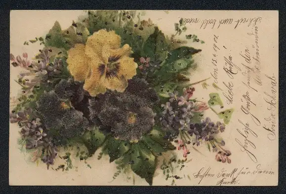 Glitzer-Perl-AK Ein Strauss Blumen mit Glitzer-Perlen
