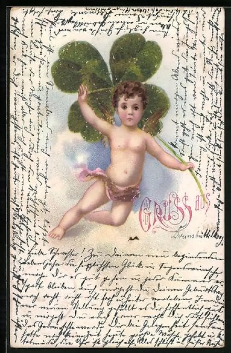 Glitzer-Perl-AK Engel mit Kleeblatt in der Hand mit Perlen