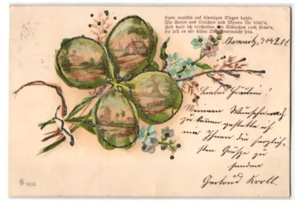 Glitzer-Perl-AK Gebäudeansichten auf Kleeblatt und Vergissmeinnicht