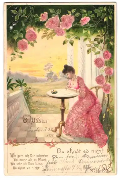 Glitzer-Perl-AK Junge Dame schreibt sehnsüchtig einen Brief