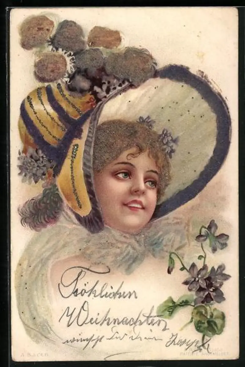 Glitzer-Perl-AK Junge Frau mit grossem Hut