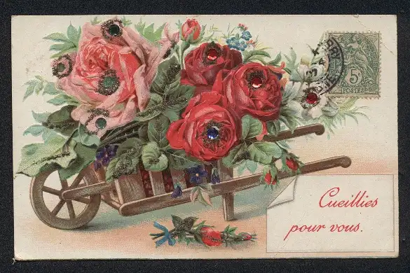 Glitzer-Perl-AK Karren mit blühenden Rosen und Glitzer-Perlen