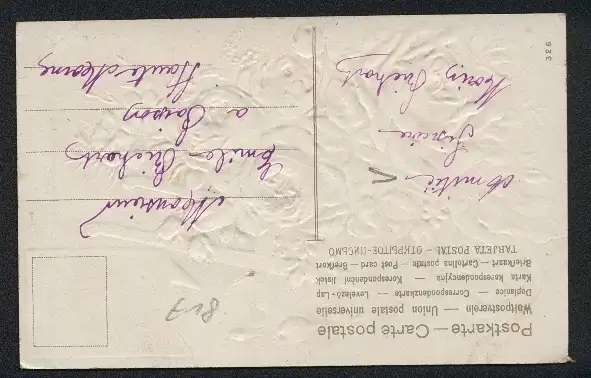 Personenbezogene Daten auf der Rückseite der Karte wurden durch blauen Textmarker unkenntlich gemacht. Die blauen Stellen sind auf die Vorderseite durchgeweicht und wirken sich negativ auf das Postkartenfoto aus