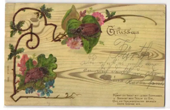 Glitzer-Perl-AK Maikäfer auf Blättern
