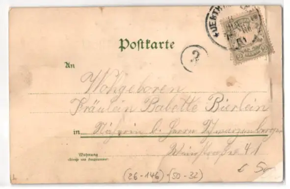 Personenbezogene Daten auf der Rückseite der Karte wurden durch blauen Textmarker unkenntlich gemacht. Die blauen Stellen sind auf die Vorderseite durchgeweicht und wirken sich negativ auf das Postkartenfoto aus