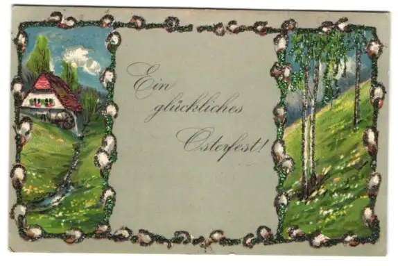 Glitzer-Perl-AK Mühle auf einer Frühlingswiese