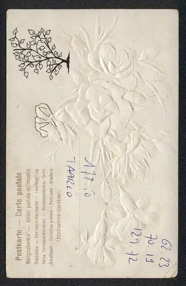 Personenbezogene Daten auf der Rückseite der Karte wurden durch blauen Textmarker unkenntlich gemacht. Die blauen Stellen sind auf die Vorderseite durchgeweicht und wirken sich negativ auf das Postkartenfoto aus