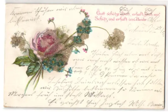 Glitzer-Perl-AK Rose und Vergissmeinnicht