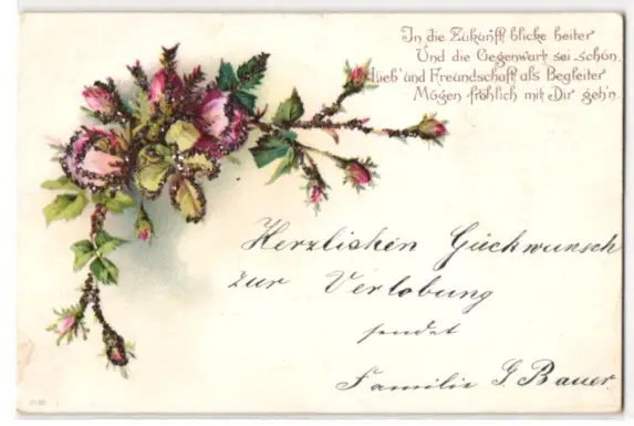 Glitzer-Perl-AK Rosenzweige mit Blüten