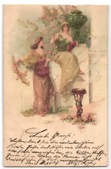 Glitzer-Perl-AK Zwei Damen an Räucherschale mit Glitzer-Perlen