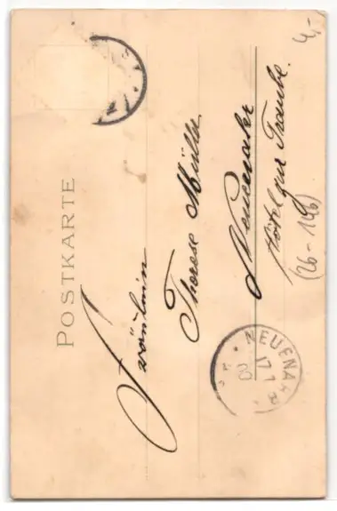 Personenbezogene Daten auf der Rückseite der Karte wurden durch blauen Textmarker unkenntlich gemacht. Die blauen Stellen sind auf die Vorderseite durchgeweicht und wirken sich negativ auf das Postkartenfoto aus