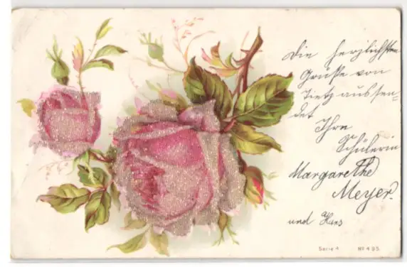 Glitzer-Perl-AK Zwei rose Rosenblüten