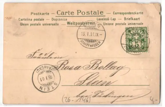 gelaufen 1901, Eckknick li. oben, Einriss re. mittig, kleinere Kantenschäden li. oben, guter Zustand