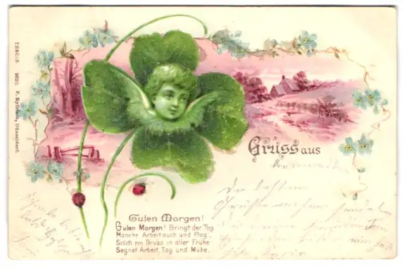 Glitzer-Perl-Perl-AK Guten Morgen, Kleeblatt mit Engel, Marienkäfer