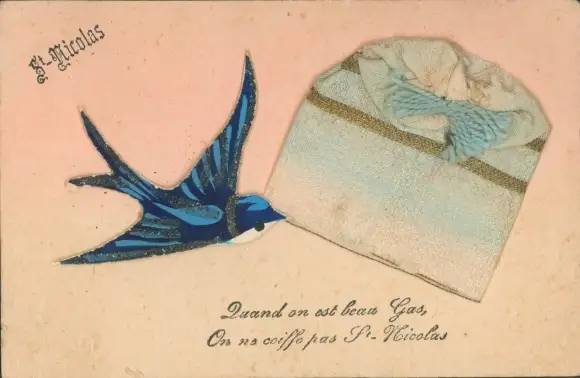 Glitzer Stoff Ak St. Nicolas, Schwalbe, Stoffhaube