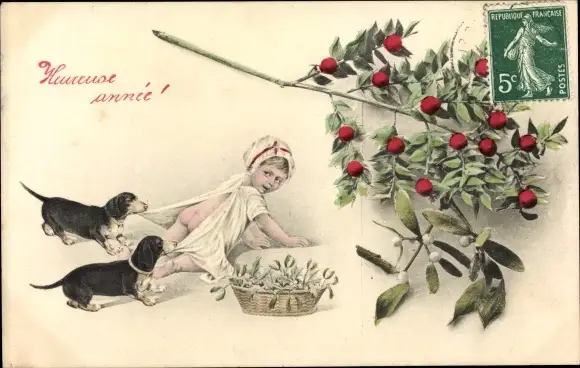Glückwunsch Ak Frohes Neujahr, Kind, nackter Po, Dackel, Stechapfel
