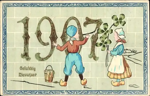 Glückwunsch Neujahr Jahreszahl Ak 1907, Klee, Kinder in Tracht