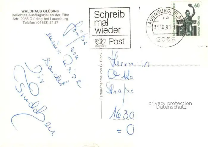 Gluesing_Lauenburg Kategorie Alte Ansichtskarten Postkarten bx45652 Gluesing_Lauenburg Waldhaus Gluesing Gluesing_Lauenburg postalisch gelaufen 1990 Erhaltung siehe scans [LiesaD40]
