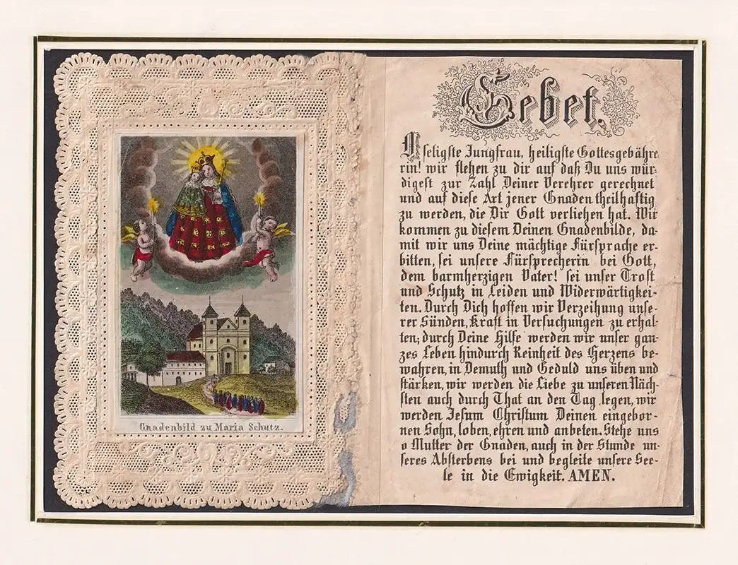 Bemerkungen: Links ist das Gnadenbild `Unsere Liebe Frau von Maria Schutz` über einer Ansicht der Wallfahrtskirche zu sehen, rechts der Gebetstext. 1925 hat der Orden der Passionisten die Wallfahrtskirche übernommen und ein Kloster gegründet, das einzige des Ordens in Österreich.
