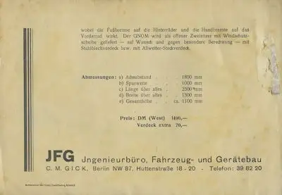 4 Seiten DinA5 JFG Ingenieurbüro Fahrzeug- und Gerätebau C.M. Gick, Berlin NW 87, Huttenstr. 18-20 Guter Zustand, leider kleines Loch, siehe Bild!