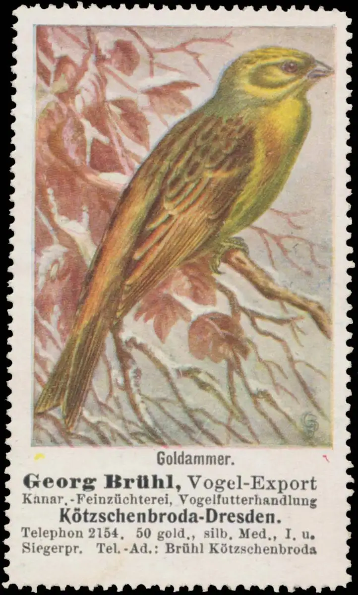 Vogel-Export, Kanar- und Feinzüchterei, Vogelfutterhandlung, Rückseite beschriftet: Vogelreklamemarken der Thüringer Kunstanstalt GmbH, Gera-Untermhaus, Größe/Zustand: 7x4 , guter Zustand, Original alte Reklamemarke die seinerzeit für die Werbung benutzt wurde