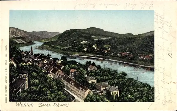 Golden Windows Leuchtfenster Ak Stadt Wehlen an der Elbe Sachsen, Ortsansicht mit Elbe