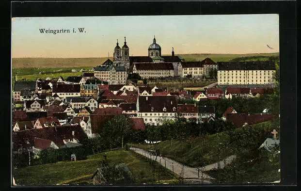 Goldfenster-AK Weingarten i. W., Teilansicht mit Benediktiner Abtei