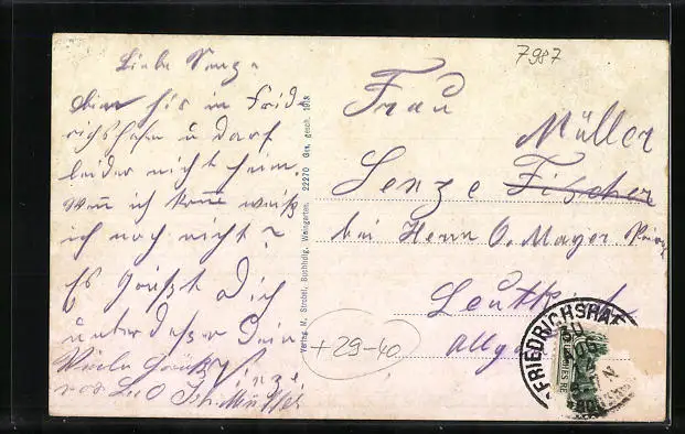 Personenbezogene Daten auf der Rückseite der Karte wurden durch blauen Textmarker unkenntlich gemacht. Die blauen Stellen sind auf die Vorderseite durchgeweicht und wirken sich negativ auf das Postkartenfoto aus