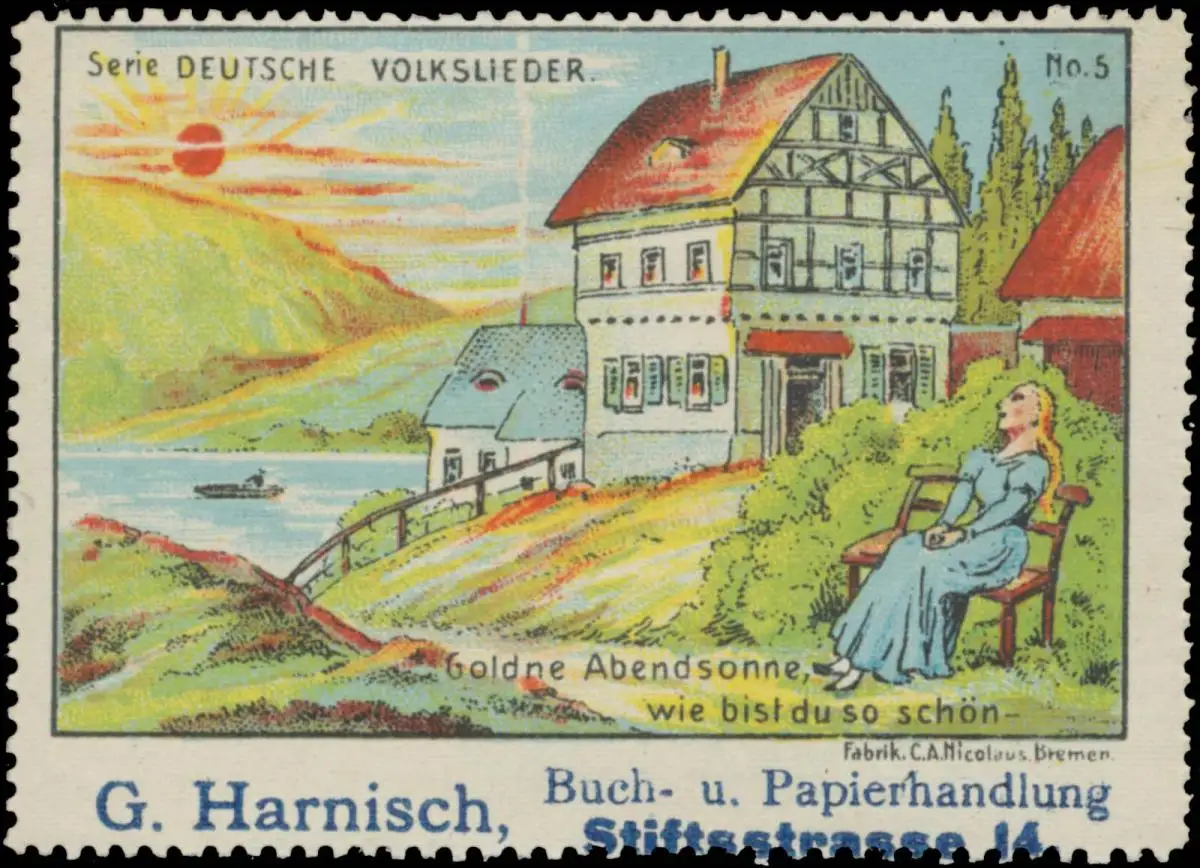 Serie Deutsche Volkslieder Nr. 5, Musik, Buchhandlung, Stifstsstraße 14, Druck: C.A. Nicolaus, Bremen, Größe/Zustand: 6x7 , leicht geknickt, Original alte Reklamemarke die seinerzeit für die Werbung benutzt wurde