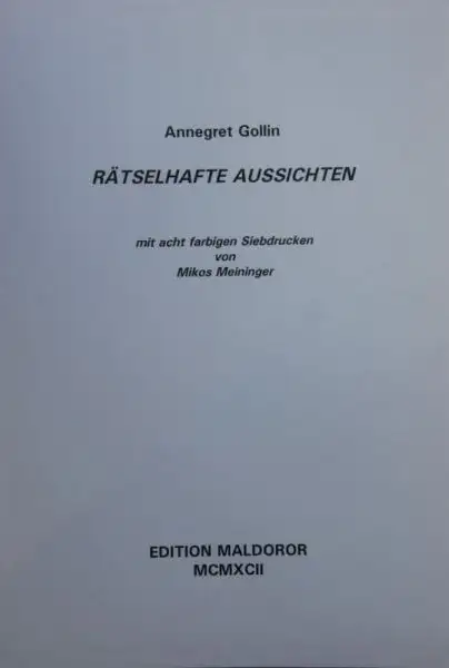 EDITION MALDOROR, Berlin, 1992. 2°. Pressendruck mit 8 signierten Original Siebdrucken von Mikos Meininger in einer Auflage von 40 Ex.. Der Band enthält 52 Gedichte und einen Anhang mit einem Text von Frank Mattern zu Annegret Gollin.