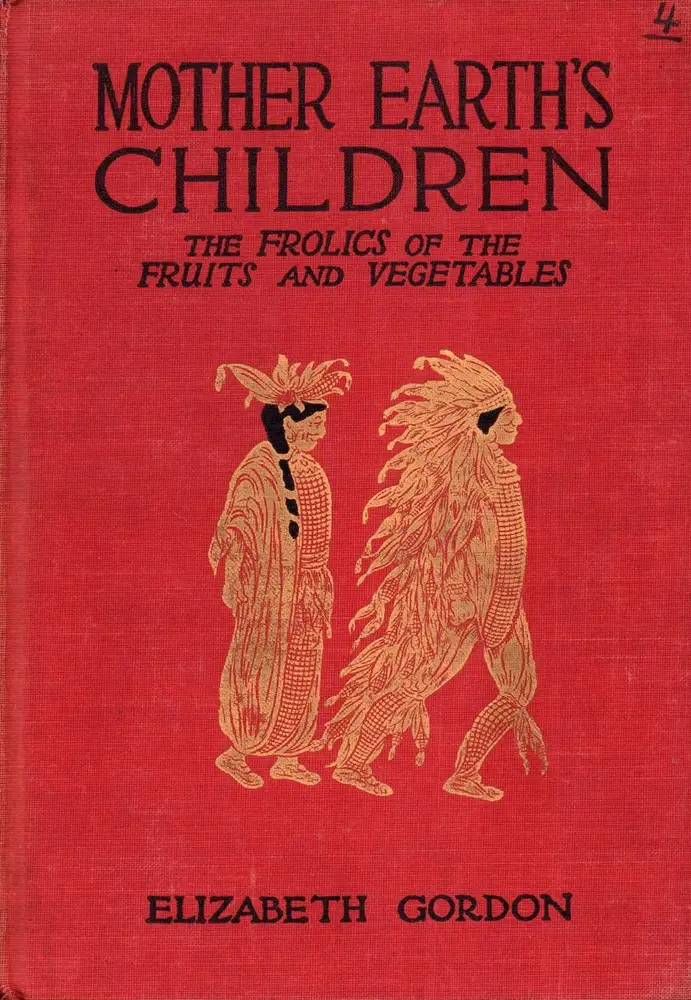 Elizabeth Gordon (1866-1922), amerikanische Kinderbuchautorin. In "Mother Earth's children", einem ihrer bekanntesten Werke, macht sie Kinder in humorvollen Vierzeilern mit den wichtigsten eßbaren Pflanzen vertraut: "Asparagus in early spring/Came up to hear the robins sing;/When she peeped out her dress was white; /It turned green in the sunshine bright". Illustrator Ross gestaltet die Pflänzchen meist als stämmige, lustige kleine Kinder, aber auch als launische Teenager, junge Damen, Indianer (Mais) u.a.m. - Kapitale/Ecken beschabt, sonst gut