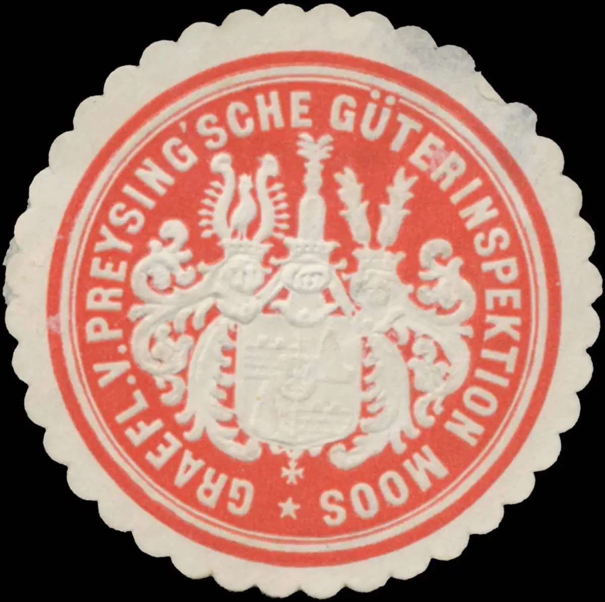 Preysing, rot, weiß, geprägt, Größe/Zustand: 4 , beschädigt, Original Verschluss-Siegelmarke aus Papier welche früher von Behörden, Firmen etc. zum Versiegeln der Briefe benutzt wurden